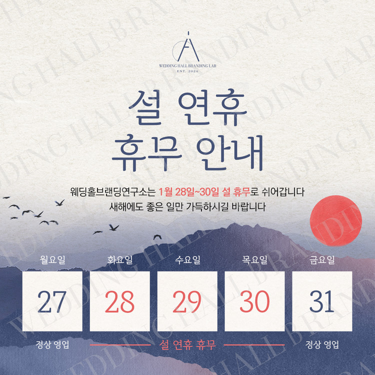 상단에는 '설 연휴 휴무 안내'라는 주요 메시지가 단정한 서체로 배치되어 있어