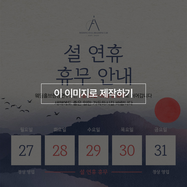 이 디자인은 설 연휴를 알리는 안내 이미지로, 전통적인 한국적 감성과 차분한 분위기를 동시에 담아냈습니다.