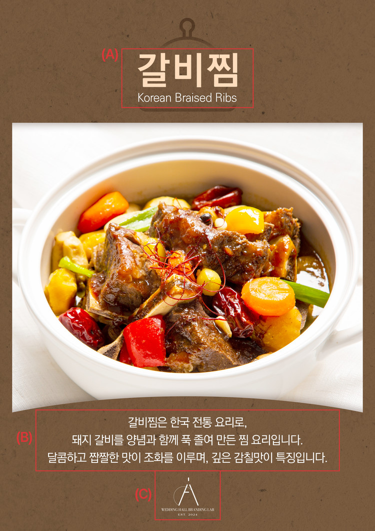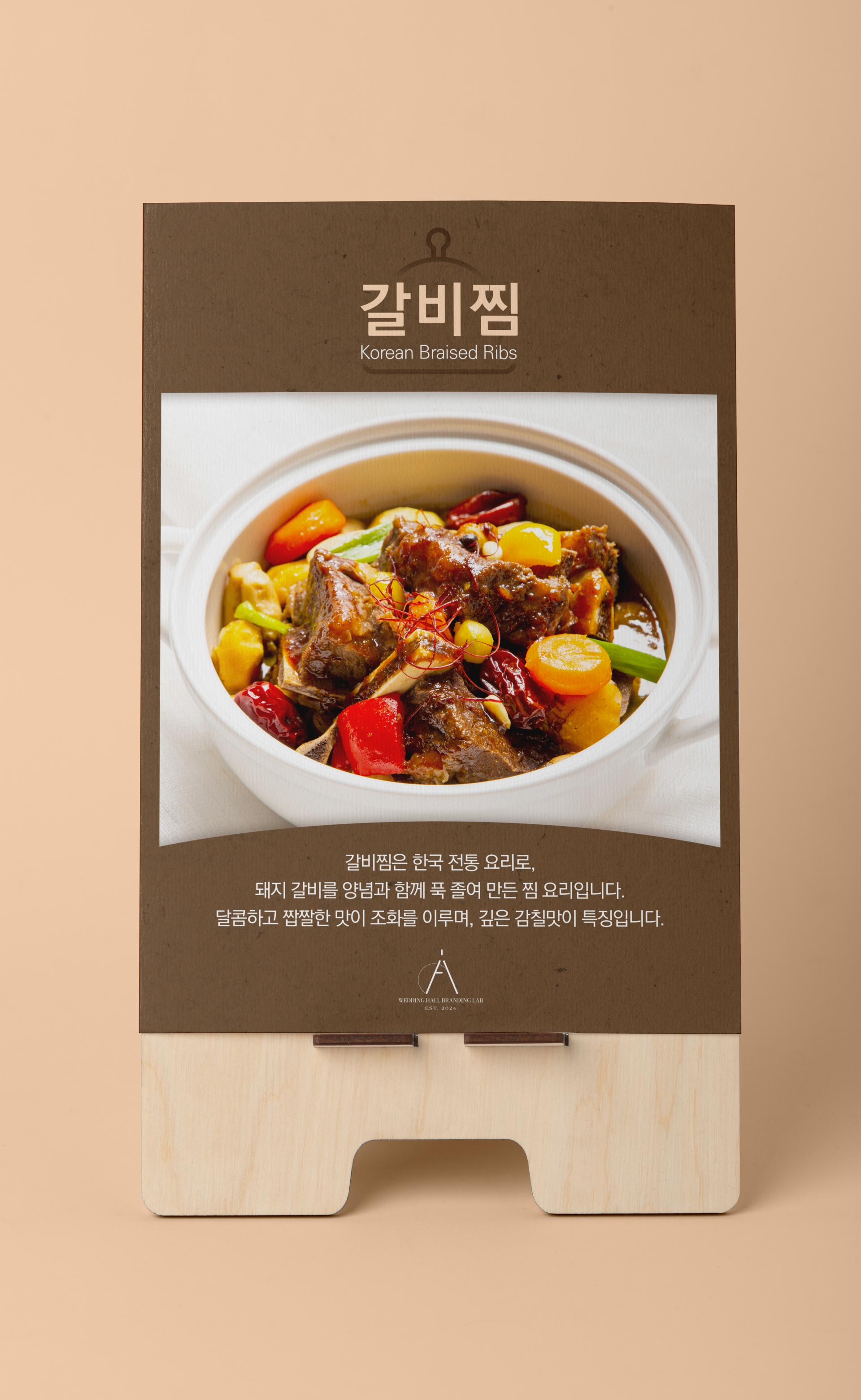 차분한 브라운 톤의 배경이 음식의 맛과 정성을 담아내며, 절제된 레이아웃이 풍미를 한층 더 강조합니다.