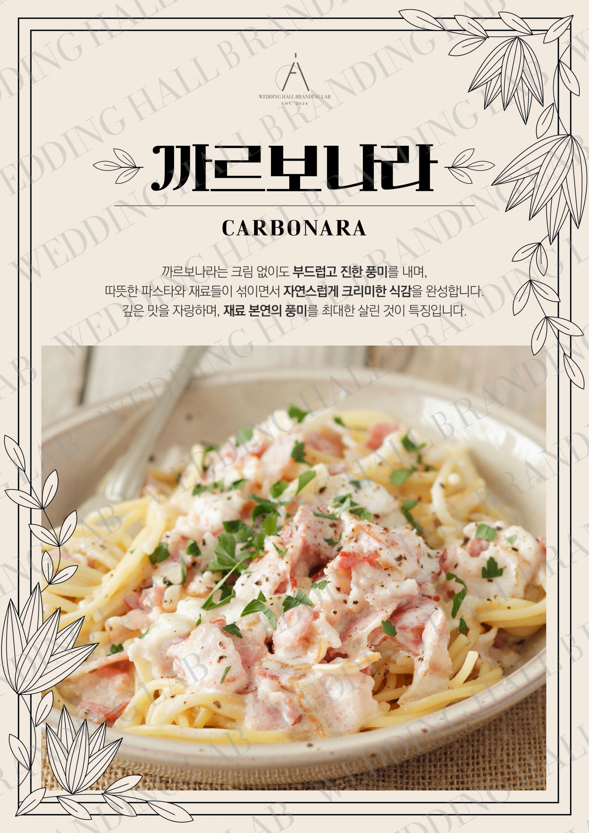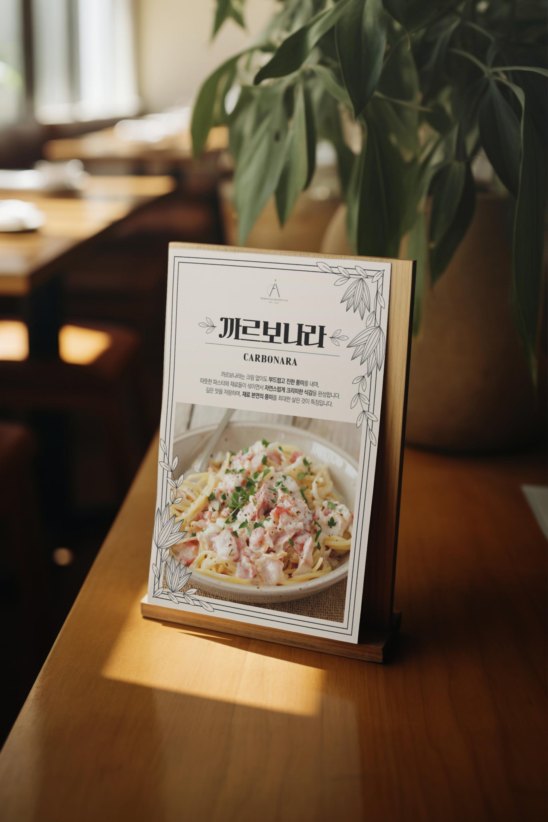 메뉴명은 두께감 있는 서체를 사용해 클래식한 멋을 살리면서도, 곡선과 직선이 조화를 이루어 세련된 느낌을 줍니다.
