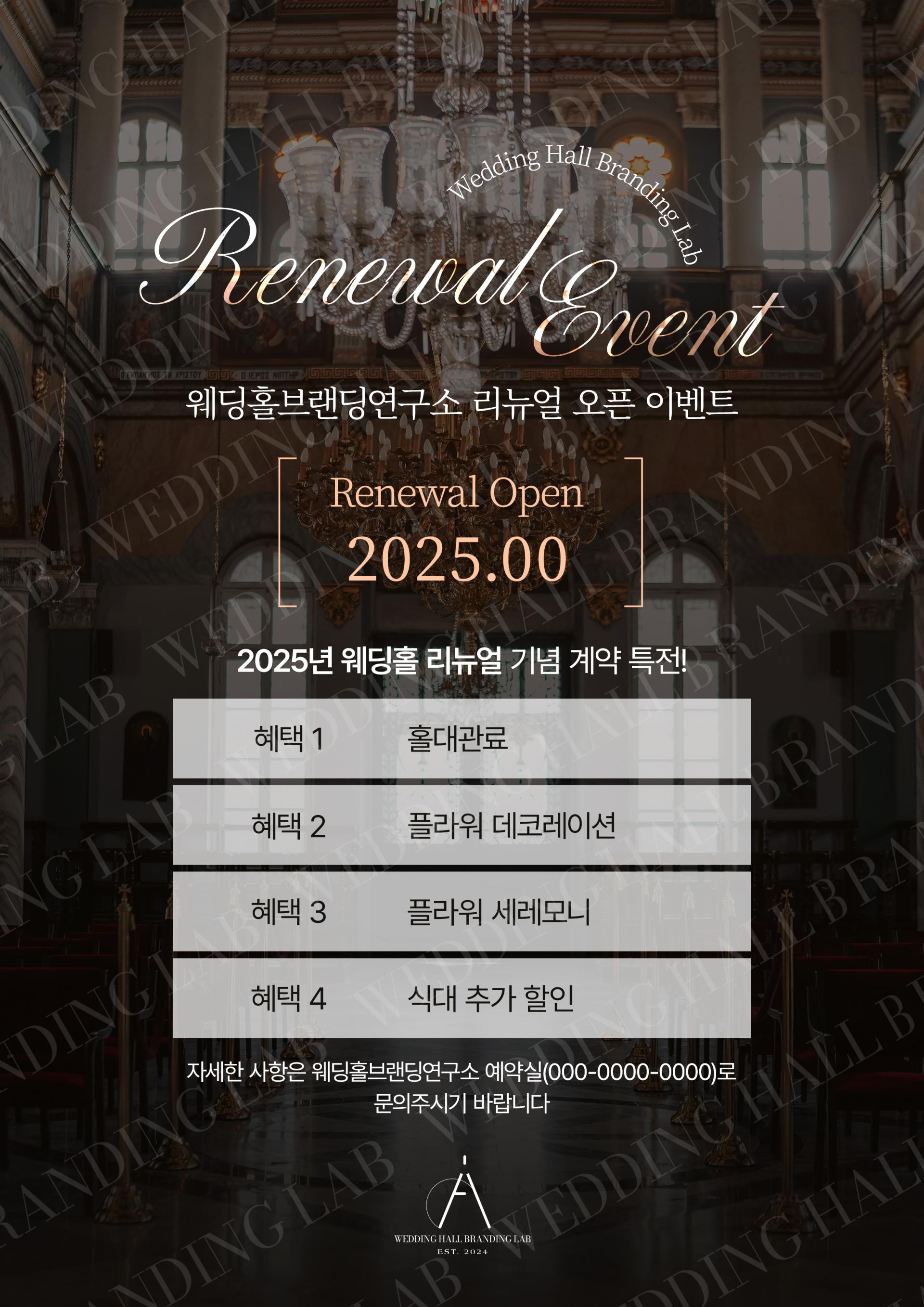 영문 캘리그래피 스타일의 ‘Renewal Event’ 타이틀은 우아한 곡선과 세련된 타이포그래피로 디자인되어, 격조 높은 분위기를 한층 더 강조합니다.