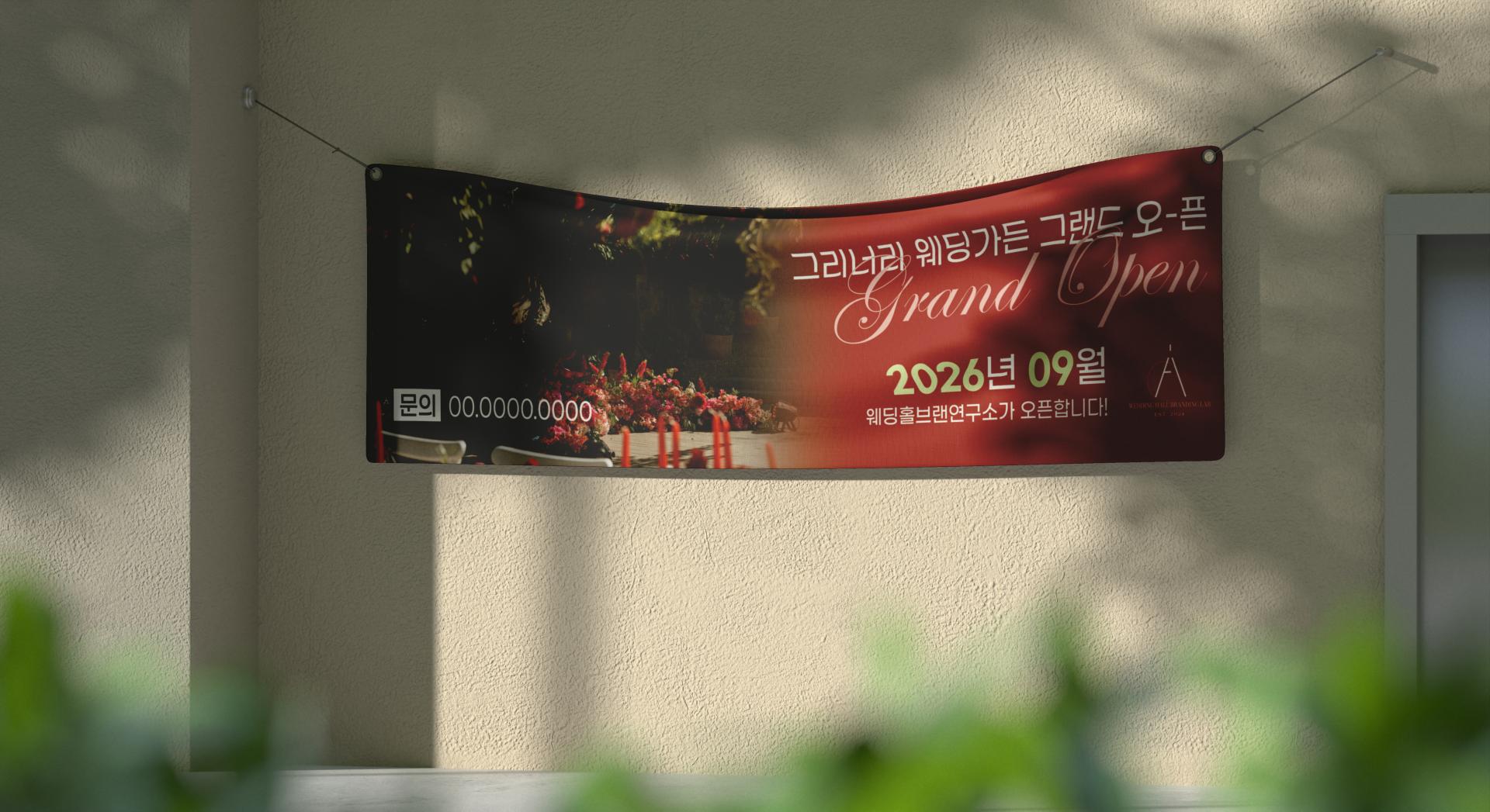 이 웨딩현수막 디자인은 따뜻한 햇살이 스며드는 로맨틱한 가든 웨딩의 분위기를 고스란히 담고 있습니다.