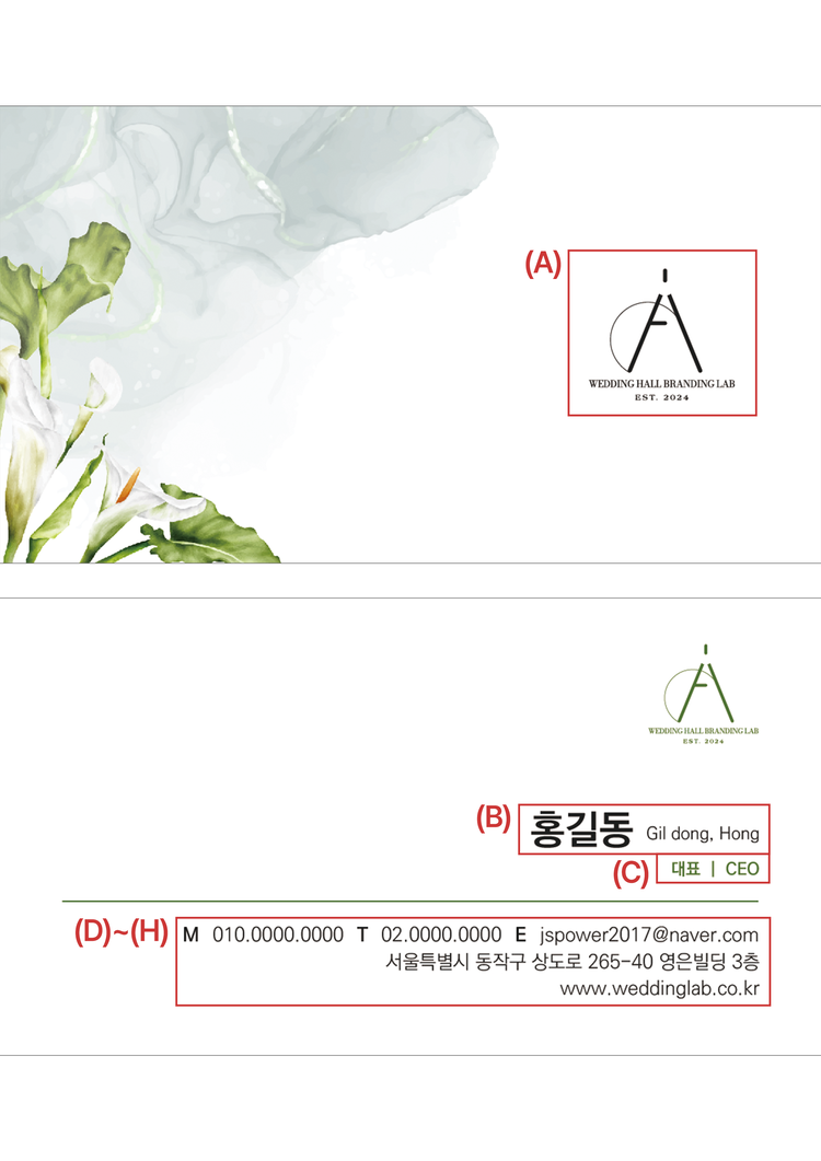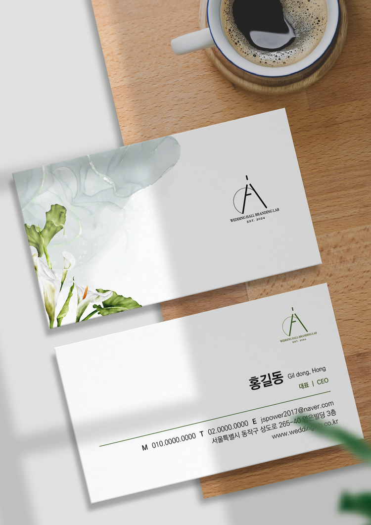 전반적으로 이 명함은 감성적이면서도 담백한 분위기를 유지하며, 웨딩홀의 우아한 정체성과 전문성을 고스란히 담아낸 디자인입니다.