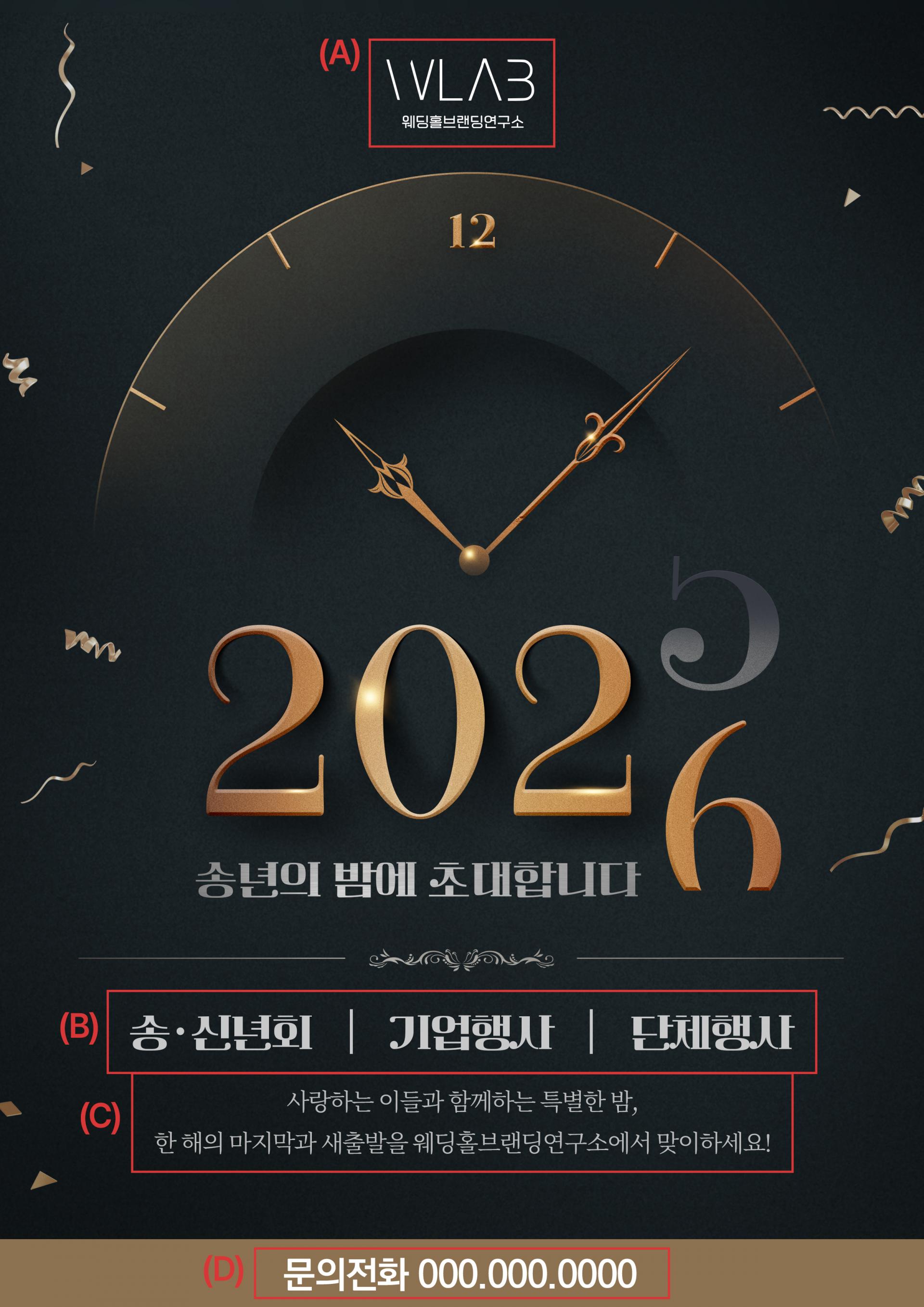 이 디자인은 검은 바탕에 금빛 시계와 숫자를 중심으로 구성되어,