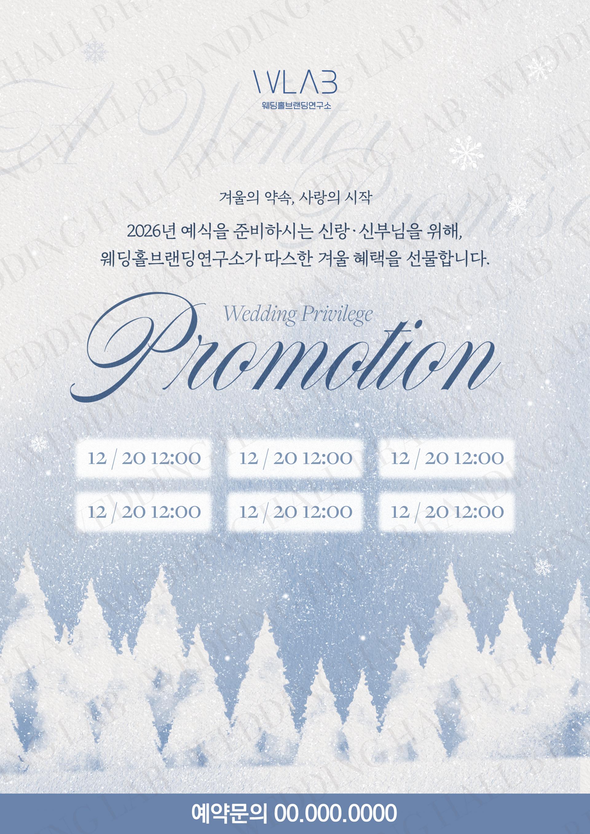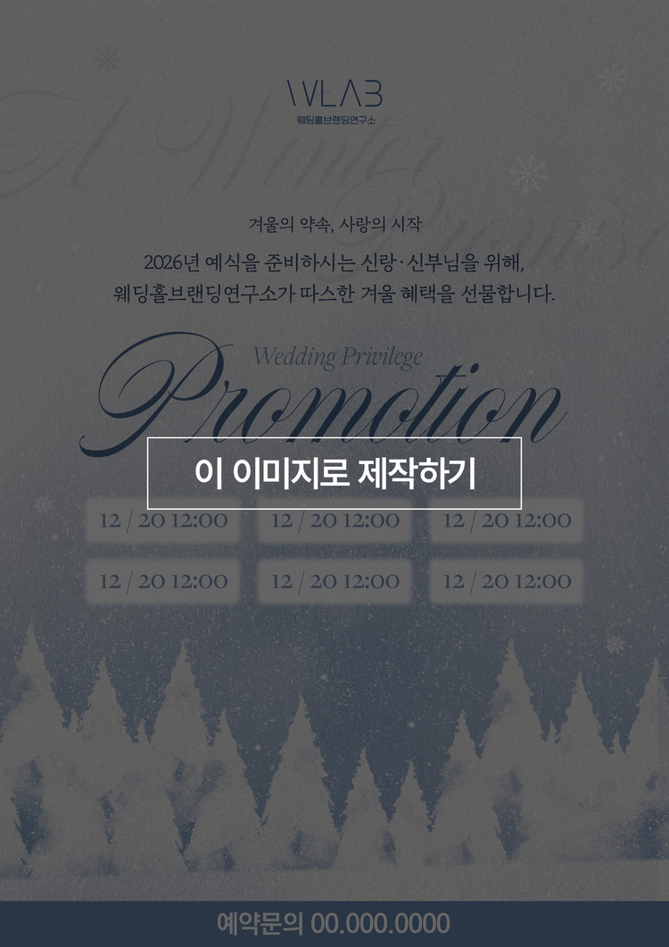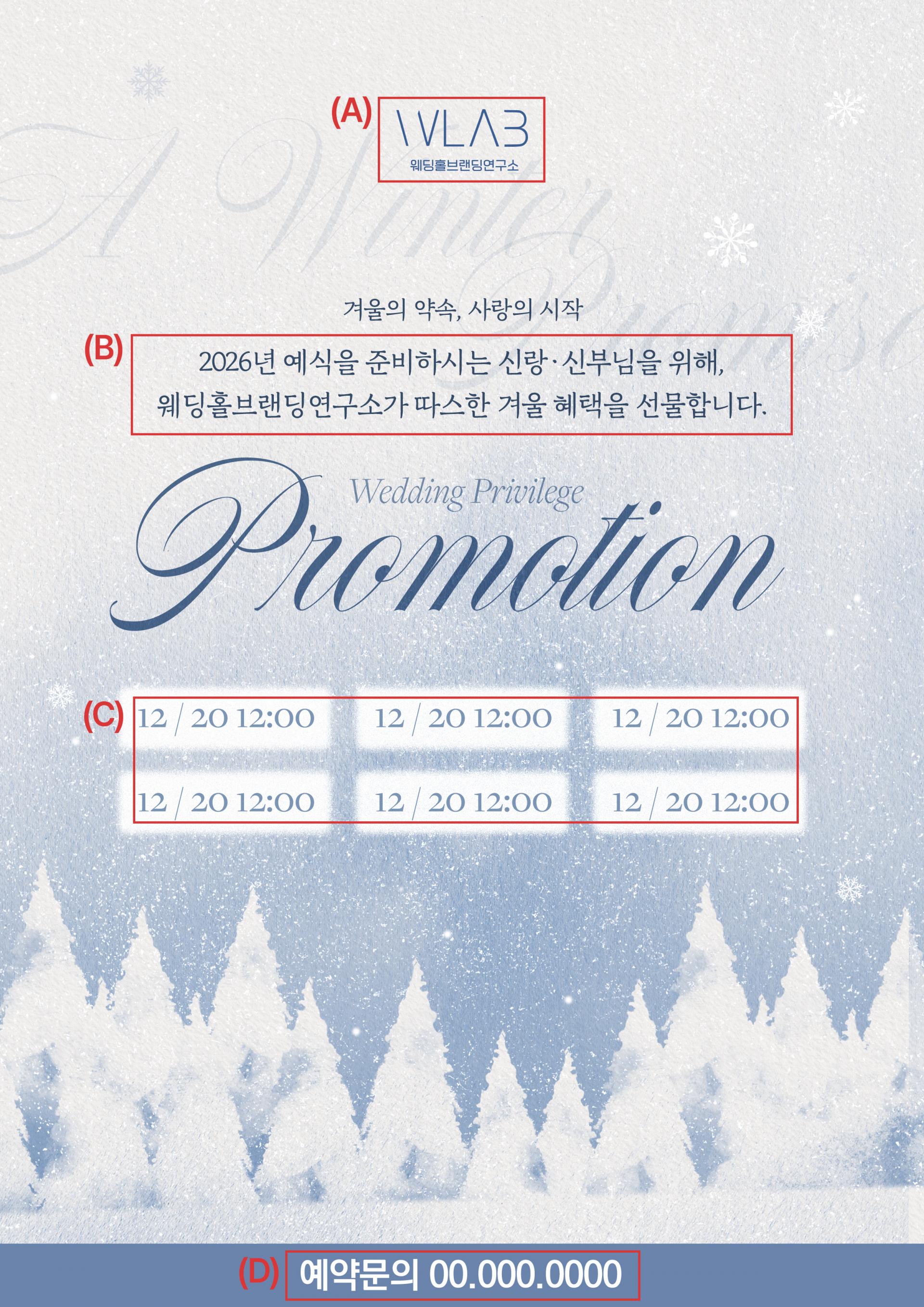 이 디자인은 ‘겨울’이라는 계절적 감성과 ‘사랑의 약속’이라는 웨딩의 상징을 부드럽게 엮어낸 프로모션 시안입니다.
