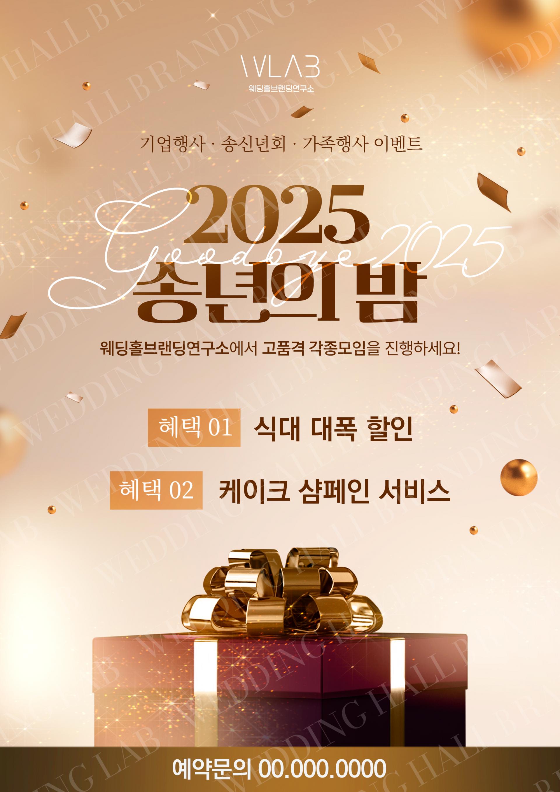 따뜻한 골드 톤과 은은한 조명감이 조화를 이루는 이 디자인은, ‘송년의 밤’이라는 콘셉트를 고급스럽게 시각화한 시안입니다.