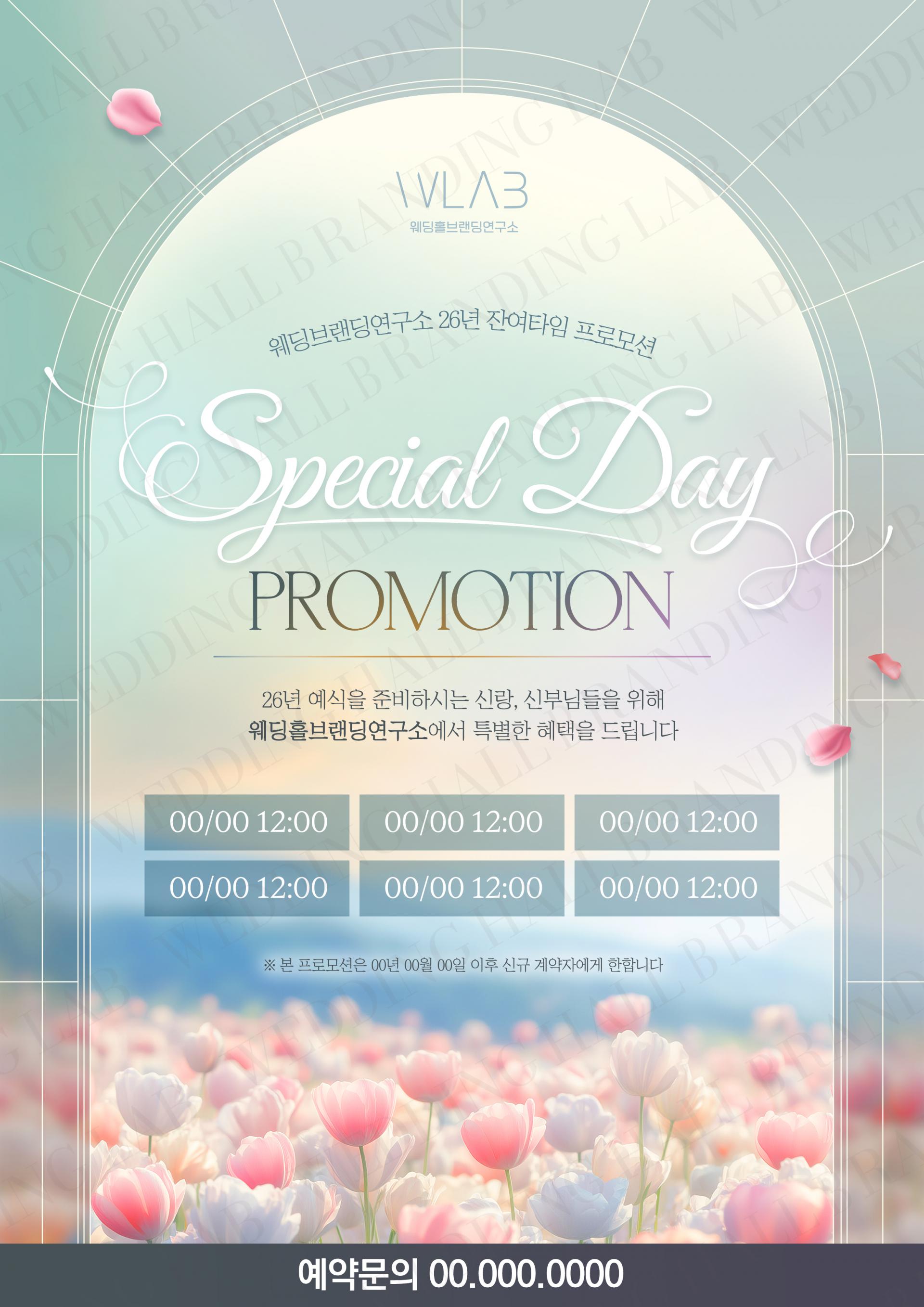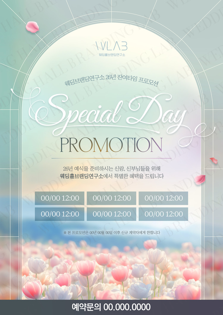 이 디자인은 은은하게 퍼지는 파스텔 톤의 그라데이션과 부드러운 곡선 장식이 어우러져, 웨딩홀이 가진 ‘특별한 하루’의 감성을 고요하게 담아냅니다.