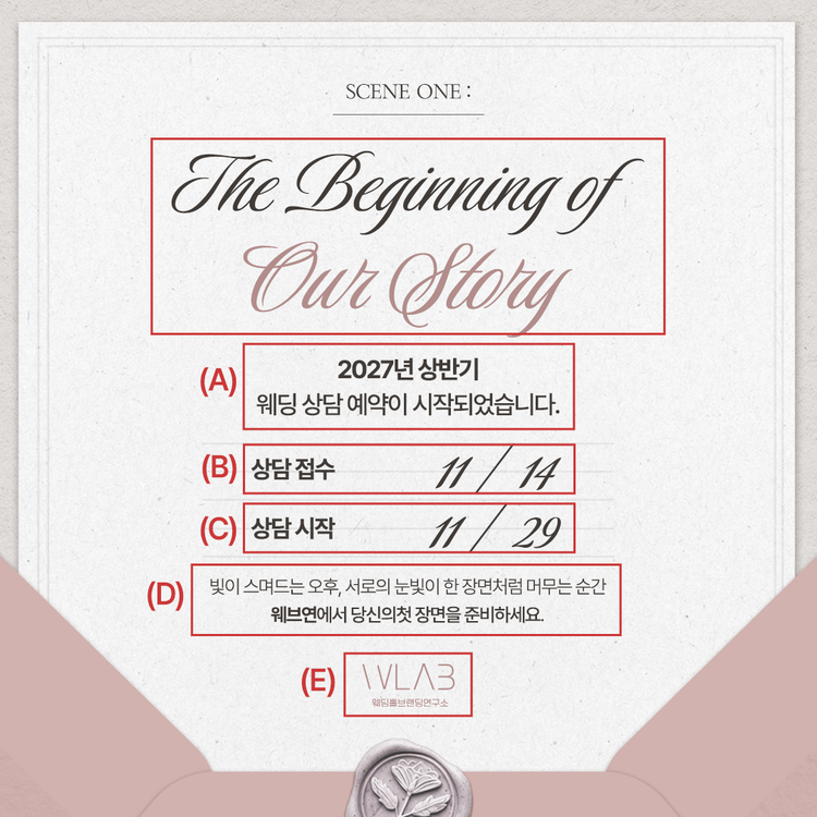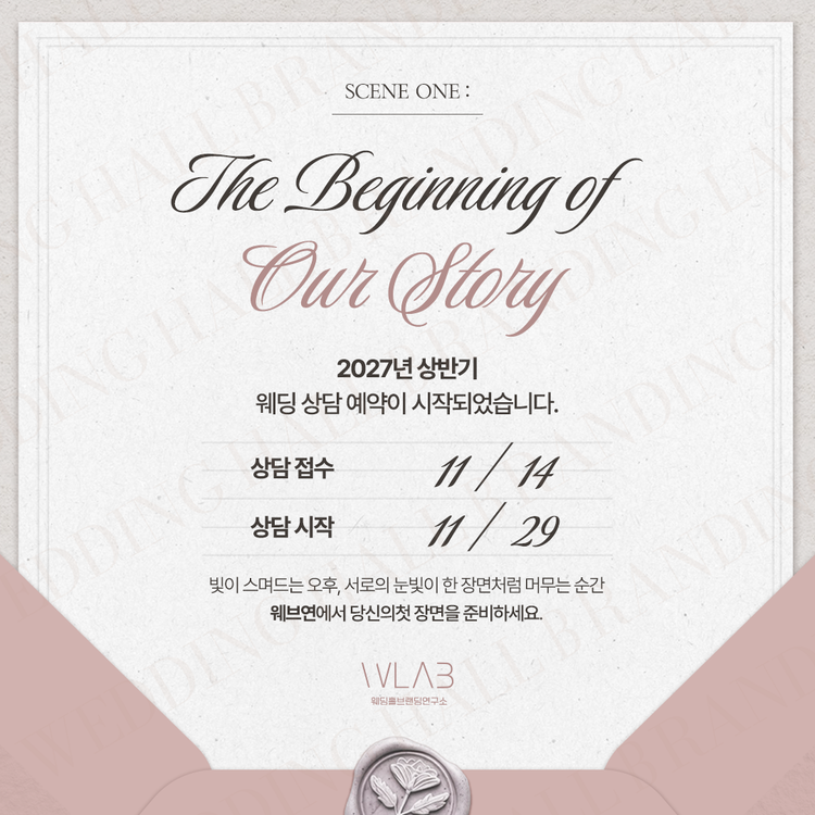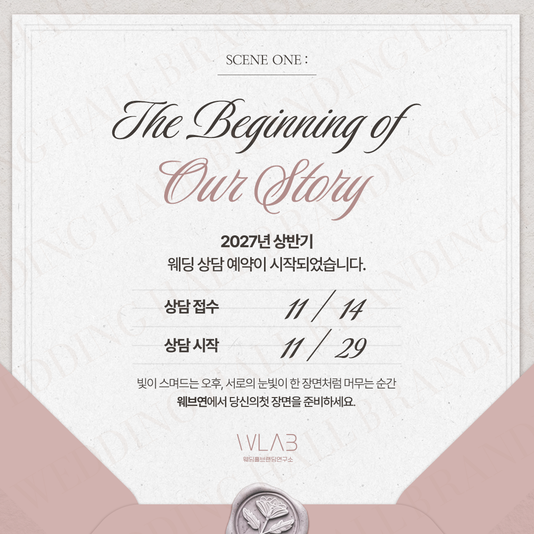 웨딩 상담의 시작을 ‘이야기의 첫 장면’처럼 따뜻하게 담아냅니다.