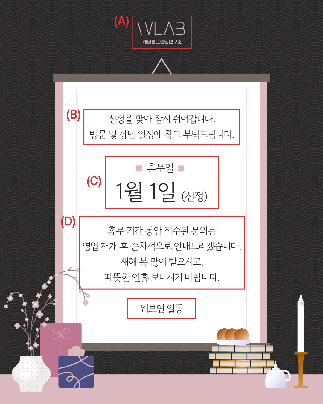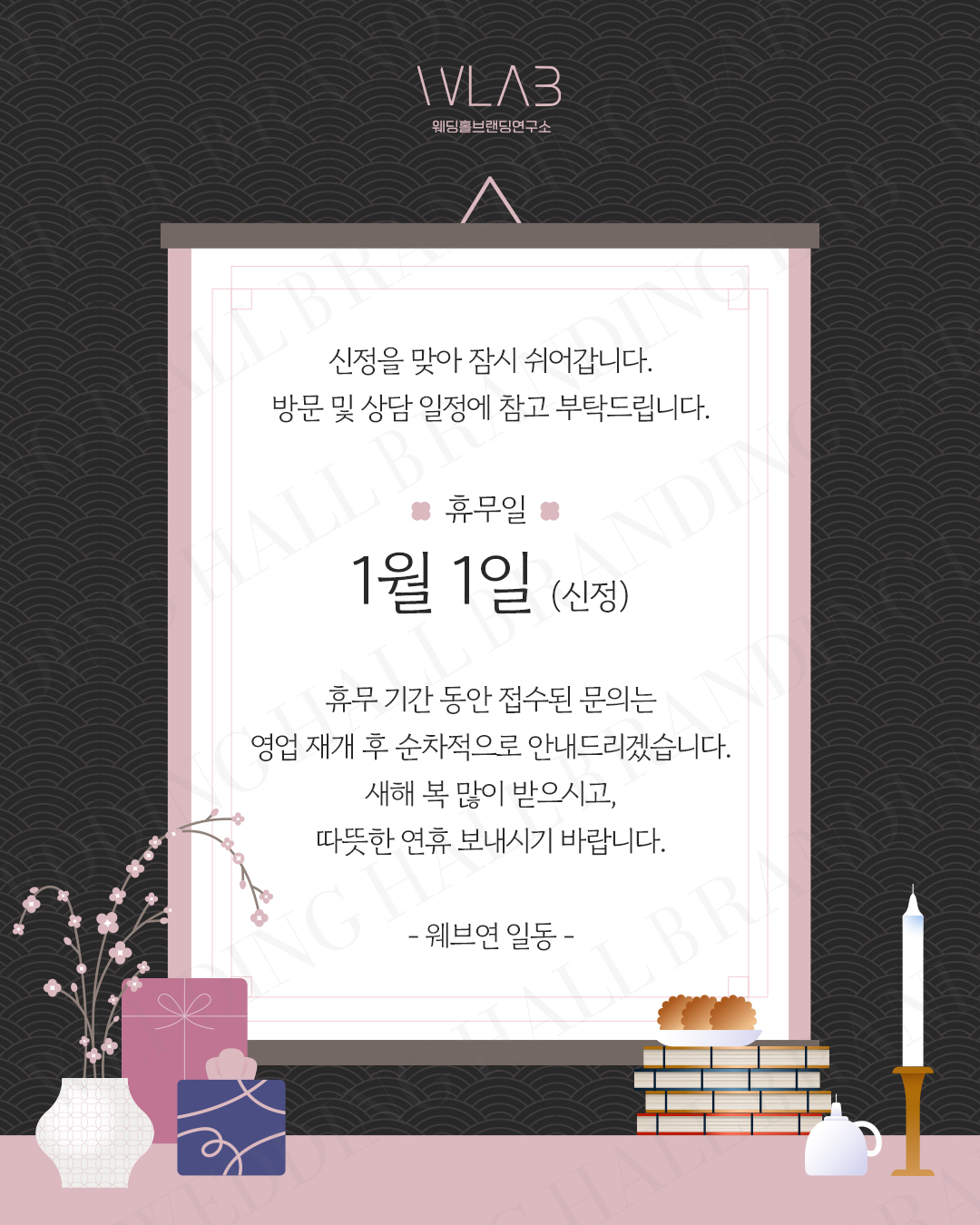 전체적으로 전통미와 모던함이 조화롭게 녹아든, 품격 있는 신정 휴무 안내 팝업 시안입니다.