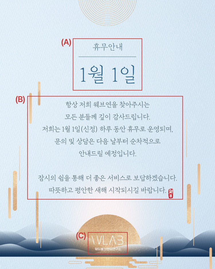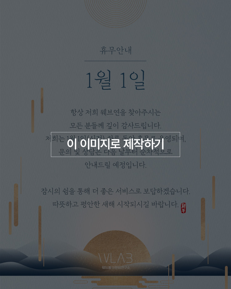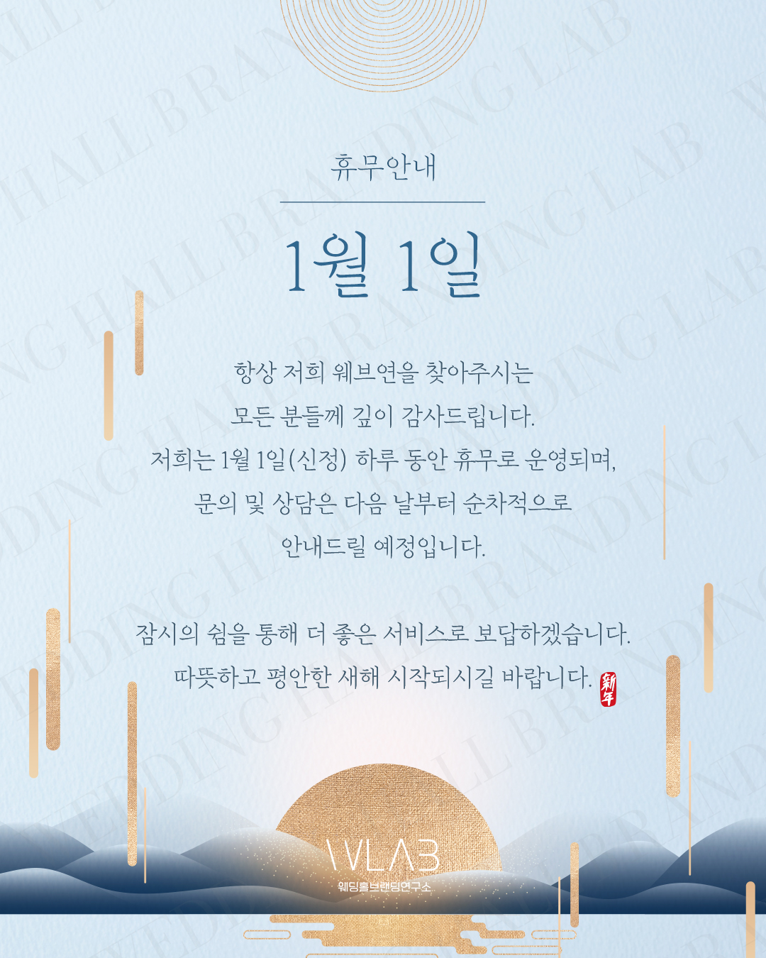 웨딩홀 브랜드의 품격을 살린 담백한 신정 휴무 안내 팝업 디자인입니다.