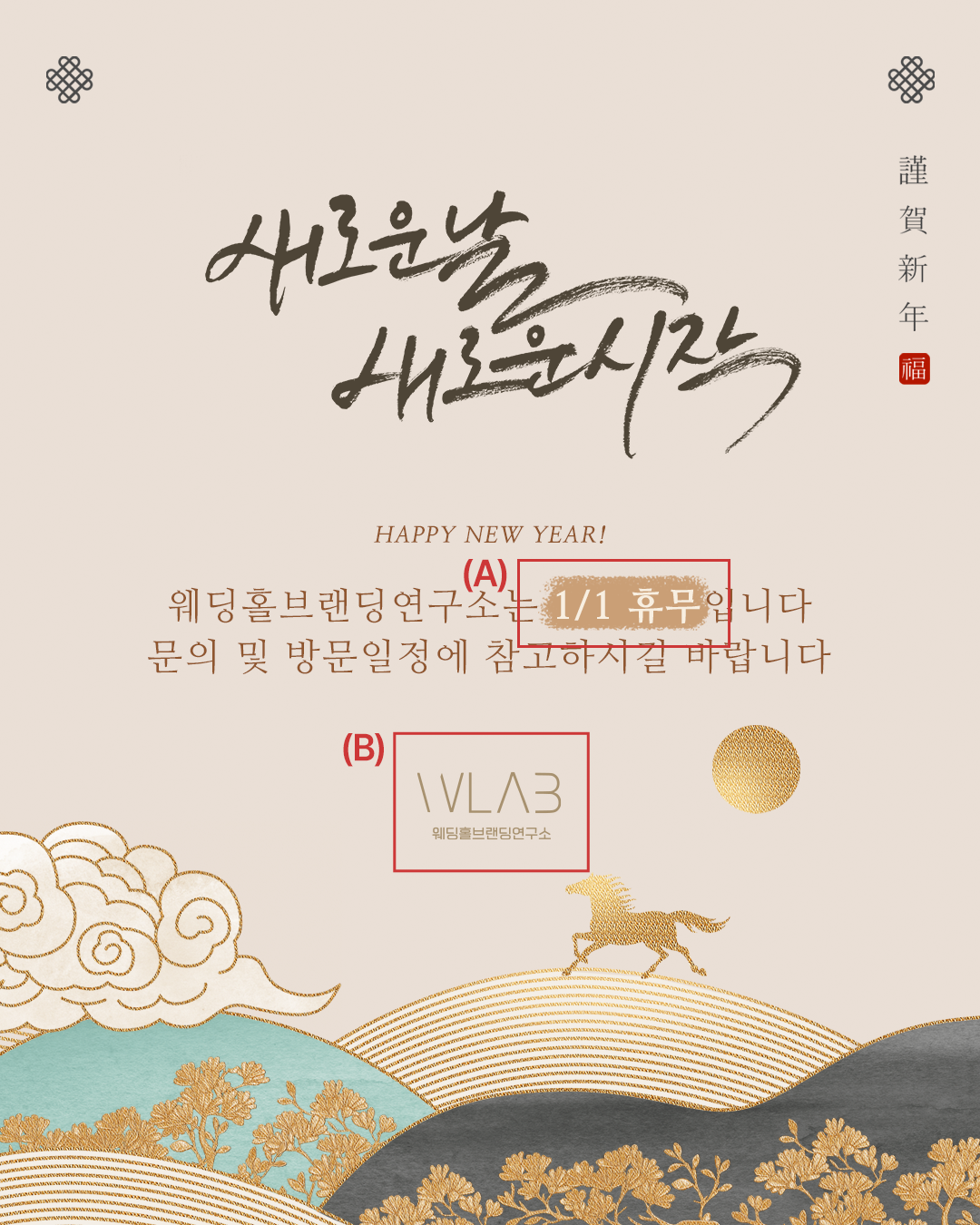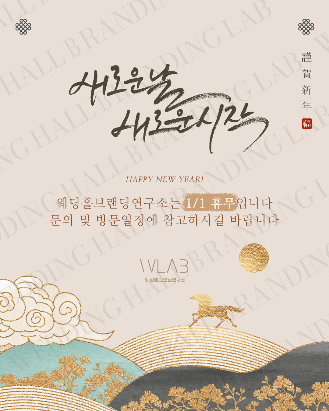 새해 인사의 힘과 기운을 직관적으로 전달하는 신정 휴무 안내 디자인입니다.