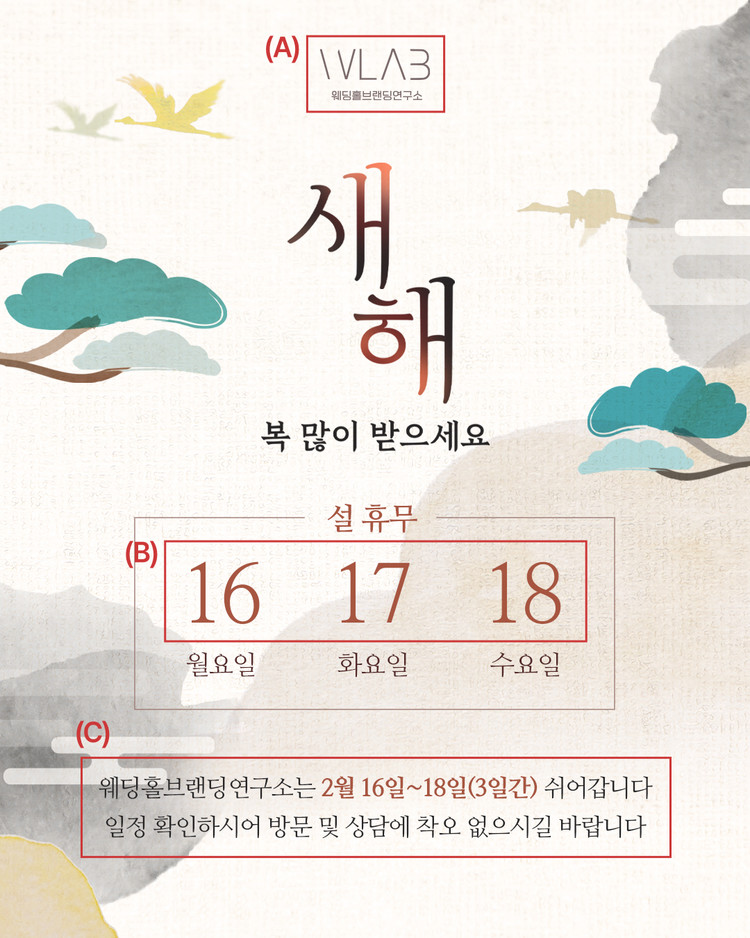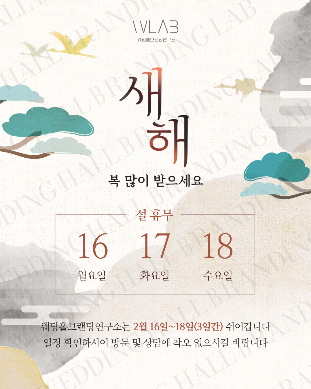 중앙의 서예형 타이포그래피는 새해 인사를 단정하면서도 힘 있게 전하고,