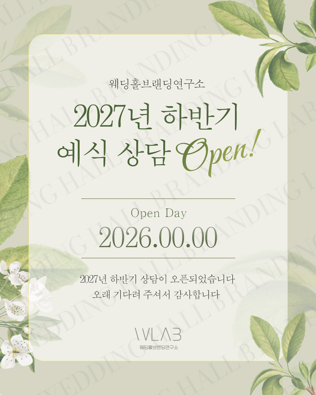 과하지 않은 장식과 정제된 레이아웃을 통해, 상담 공지 이미지이면서도 웨딩홀 브랜드 톤을 안정적으로 유지하는 디자인입니다.